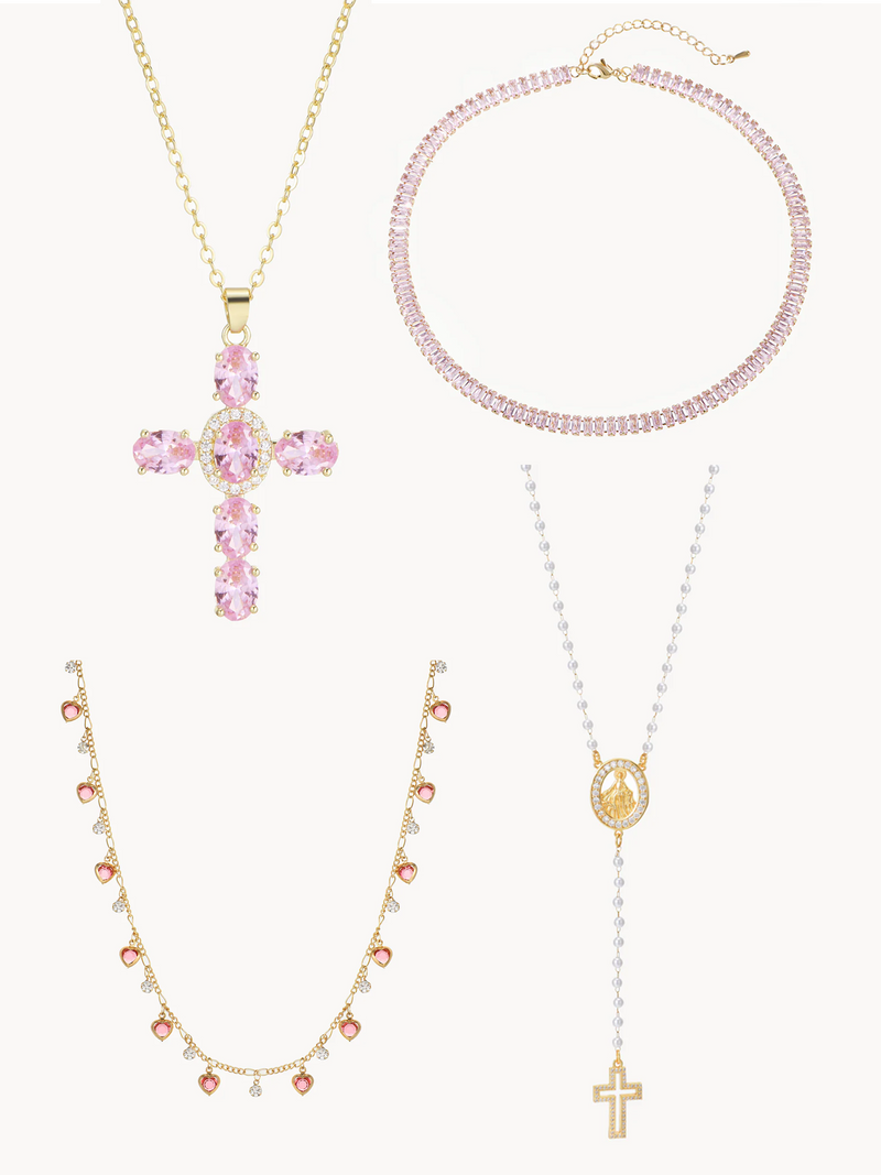 This set includes Elvira Pink Cross Necklace, Ada Pink Hearts Chain Necklace, Josie Pink Golden Choker Necklace and Grace Pearl Cross Lariat Necklace.
