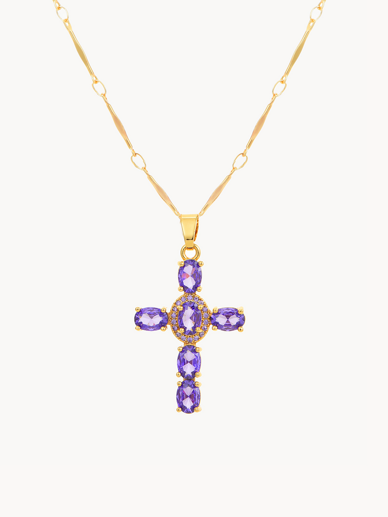 Elevate your style with the Elvira Purple Cross Necklace, featuring a delicate cross design adorned with pink CZ stones for a radiant, shiny finish. Elegant and timeless, this necklace is the perfect statement of grace and sophistication.