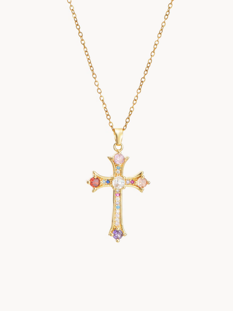 Featuring a stunning array of vibrant stones set in a chic and dainty cross design, this necklace adds a playful yet elegant touch to any outfit. Perfect for layering or as a standout piece, it brings a pop of color and sparkle to your jewelry collection.